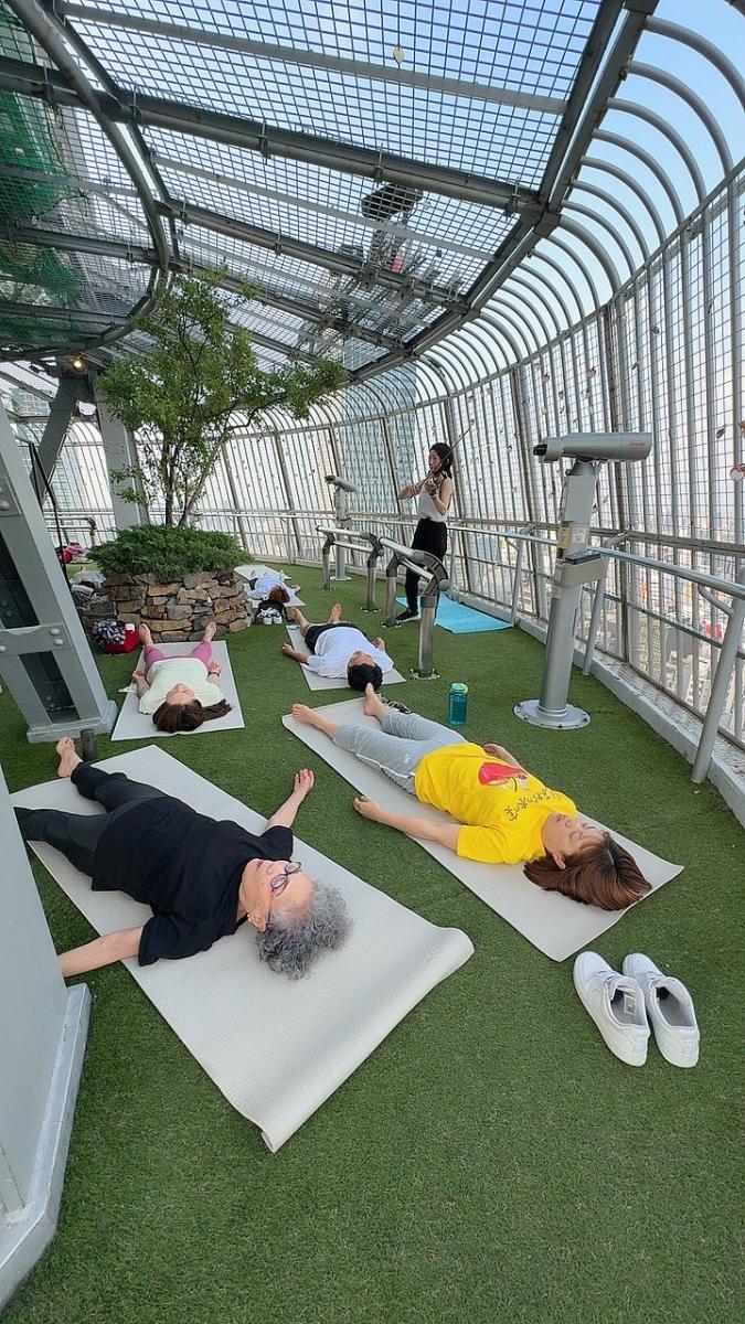 スカイデッキMIRAI360からの清々しい朝空を眺望しながら行うヨガは都会のオアシス名古屋ならでは。シャバーサナとバイオリン生演奏は贅沢なひと時となります。