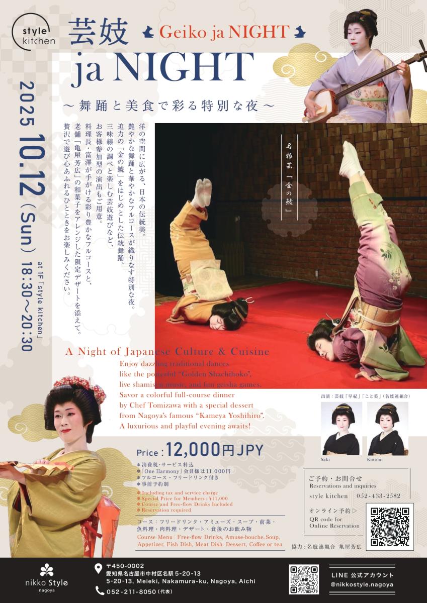 ニッコースタイル名古屋のレストラン「style kitchen(スタイルキッチン)」では、2025年10月12日(日)に、名古屋で70年以上の歴史を持つ「名妓連組合(めいぎれんくみあい)」のふたりの芸妓による雅やかな和の伝統芸の数々とともに、地元産食材と秋の味覚をふんだんに取り入れた華やかな特別ディナーコースをお楽しみいただく特別イベント『芸妓 ja NIGHT』を開催いたします。
