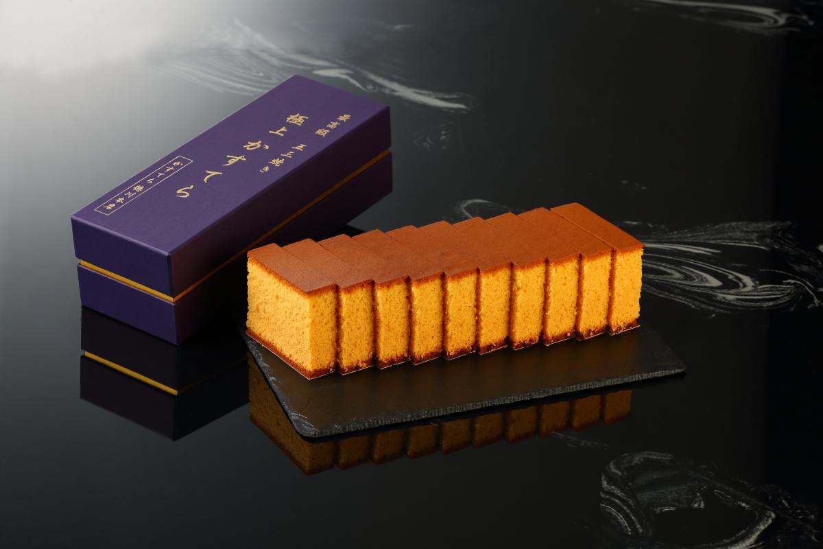 当店の作る「極上かすてら」は名古屋コーチンの卵を100%使用し、卵黄を通常よりも多く配合する“五三焼き”で仕上げる極上のカステラです。