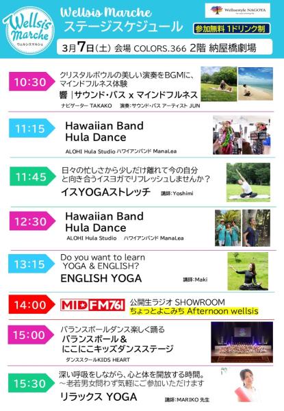 名古屋の観光を少し楽しみたい~ランナー様またご家族様への3月7日(土)のみの1DAY企画となっています。 サウンドバス・瞑想・YOGA・ハワイアンバンド・Meaningful marche・Wellness Food・Workshop&stage にてランナー様を応援!