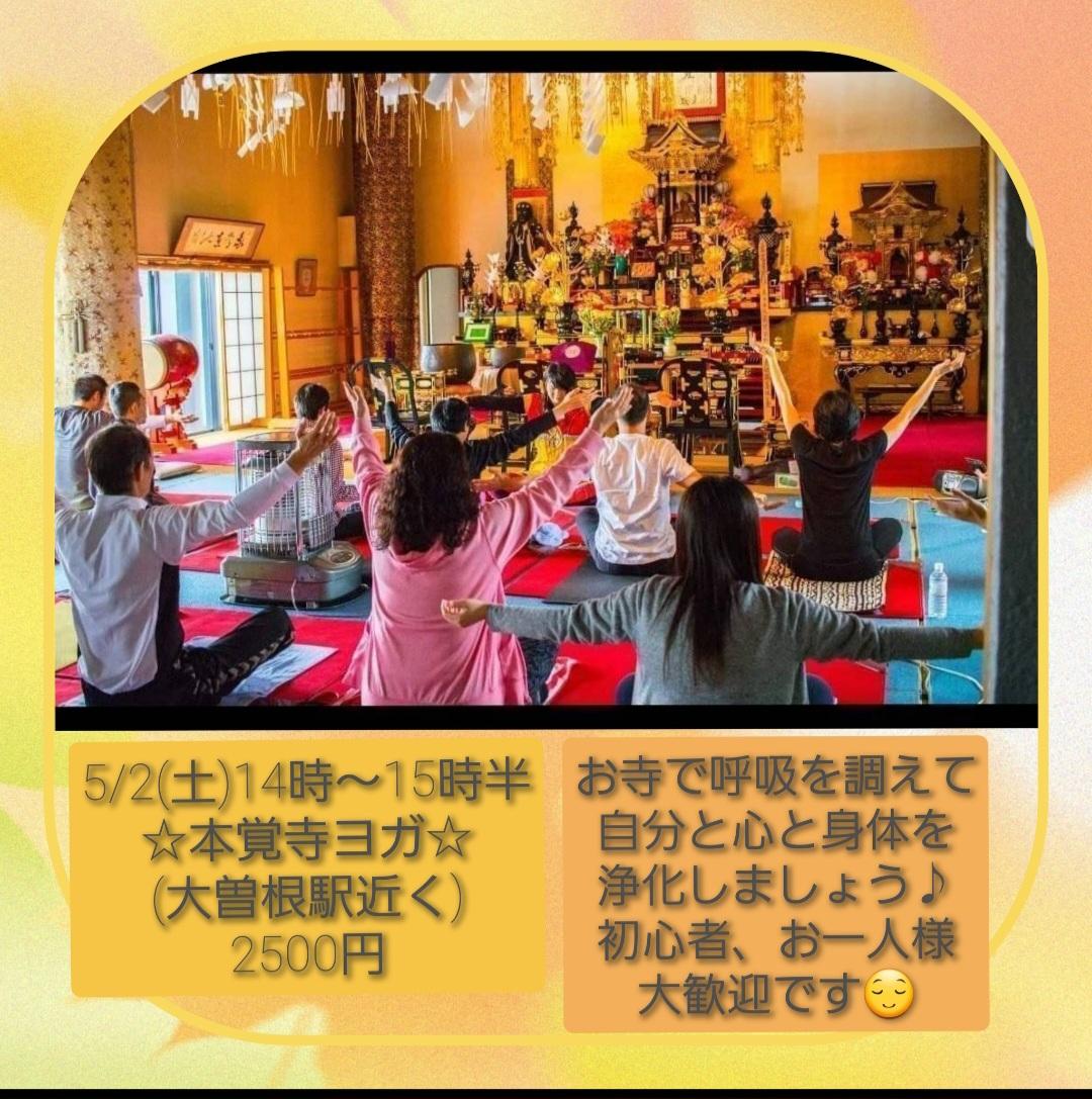 ヨガは、肩こり、腰痛、自分を見つめることができ、気持ちが豊かで優しい気持ちになります。更に、お寺でヨガをすることで普段のヨガよりも浄化の力が強くなります。