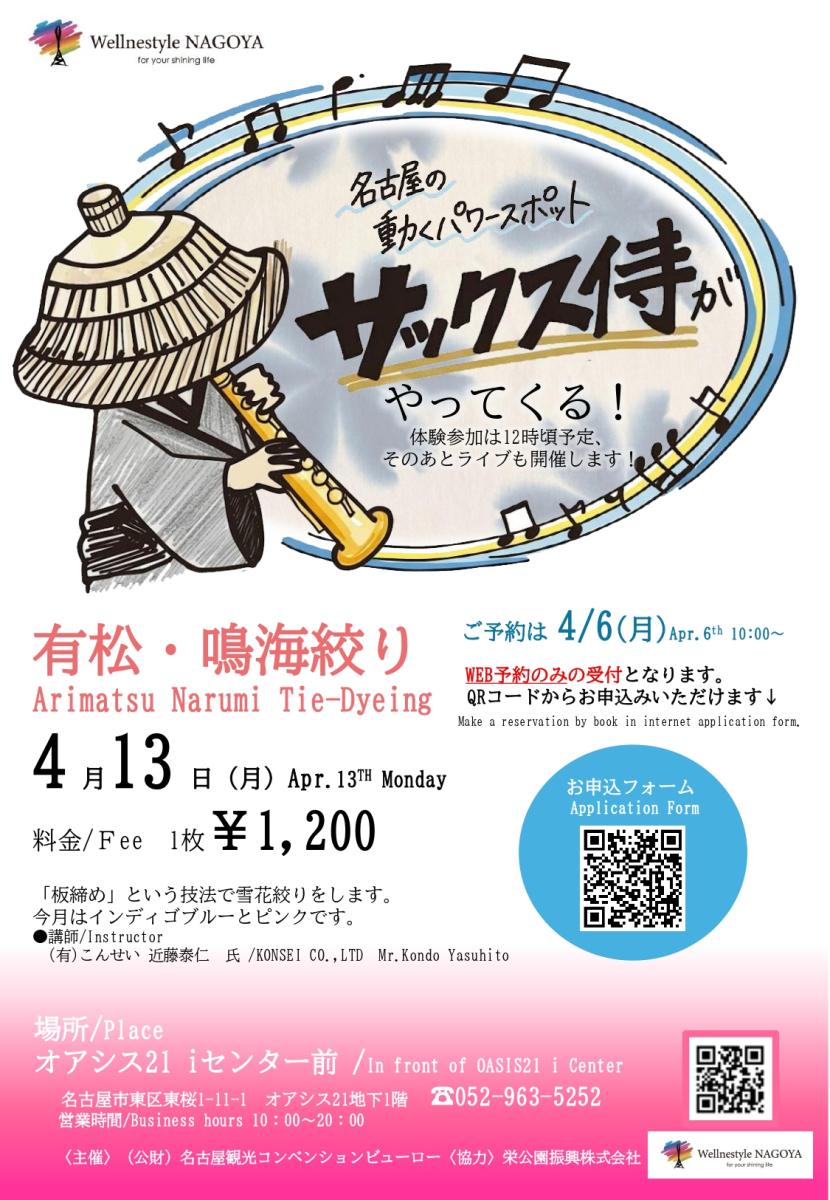 名古屋の“動くパワースポット”として知られるサックス侍が、オアシス21iセンター前で開催する「有松・鳴海絞染め体験(実施:有限会社こんせい)」にやってきます! サックス侍がみなさんと一緒に有松・鳴海絞りを体験する貴重な一日。名古屋の伝統工芸と、心地よいサックスの音色を楽しむ特別な一日を過ごしませんか?