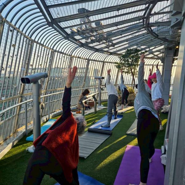 スカイデッキ MIRAI360 からの清々しい朝空を眺望しながら行うヨガは、都会のオアシス名古屋ならでは。